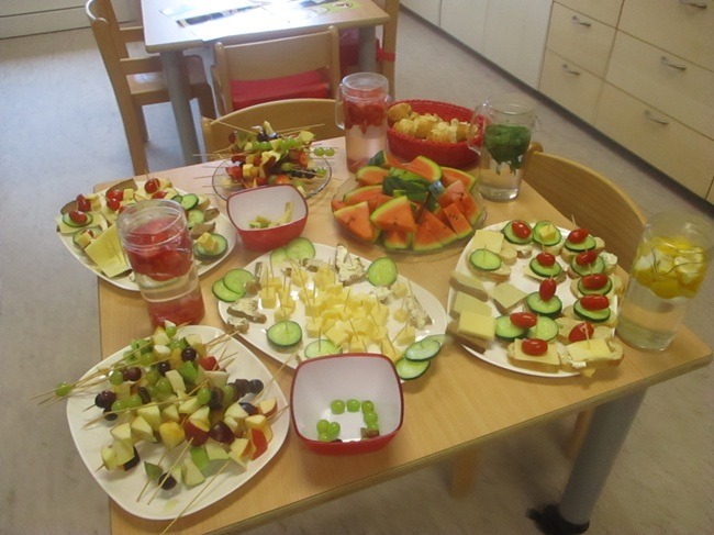 Es gab Drachenspieße aus Brot, Tomaten, Käse, Frischkäse und Gurke. Die Regenbogenspieße wurden aus ganz vielen unterschiedlichen Obstsorten hergestellt. Ganz besonders war das bunte Obstwasser aus Erdbeeren, Minze und Zitrone.